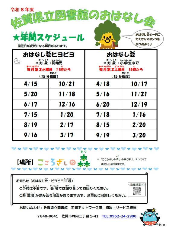 おはなし会・おはなし会ピヨピヨは予約不要です。会場では譲り合ってお座りください。駐車場が混み合う場合がありますので、お早めにお越しください。 ・駐車場の(平日利用)ご案内(こちらをクリック) ・駐車場の(土日利用)ご案内(こちらをクリック) おはなし会(対象:小学生まで) 次回じかいのおはなし会かい 4月18日にち 15時じから (毎月第3土曜日に開催) おはなし会かいピヨピヨ(対象:乳幼児) 次回じかいのおはなし会 ピヨピヨ 4月15日にち 11時じから(毎月第3水曜日開催) おはなし会かいの様子ようす おはなし会かいの様子ようすはこちら↓