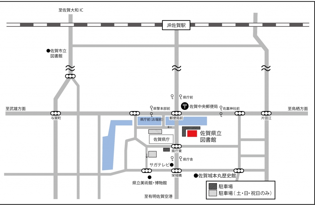 電車の場合JR佐賀駅から、1.6㎞(徒歩20分)タクシーで約7分バスで約10分(佐賀駅バスセンターで県庁前経由のバスに乗車、県庁前で下車)佐賀駅バスセンター乗り場案内等はこちら 自動車の場合高速道路(長崎自動車道)佐賀大和インターチェンジから、8.6km(約25分)県立図書館本館の駐車場はこちら 飛行機の場合有明佐賀空港から、10km空港発のアクセスバスに乗車し、「県庁舎」バス停で下車(約20分)有明佐賀空港発着のバスはこちら 佐賀市営バス以外のバスの場合西鉄バス:「片田江」バス停で下車昭和バス:「県警本部前」バス停で下車祐徳バス:「県庁前」バス停で下車大きな地図で見る画像を開く(363KB;Jpeg)